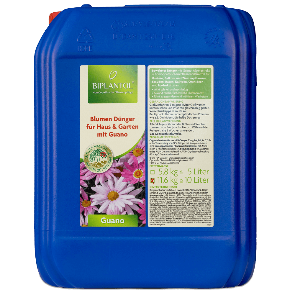 Du suchst nach einem Dünger, der deine Pflanzen in Haus, Garten und auf dem Balkon gleichermaßen zum Strahlen bringt? Biplantol Blumendünger Guano ist die perfekte Lösung. Dieser biologische, organisch-mineralische Flüssigdünger kombiniert die bewährte Kraft von Seevogel-Guano mit einem ausgewogenen NPK-Verhältnis und wichtigen Spurenelementen. Er ist ideal für alle Pflanzen – von farbenfrohen Blumen über kräftige Gemüsepflanzen bis hin zu empfindlichen Orchideen.