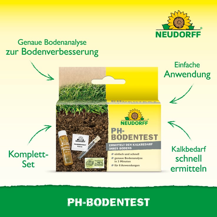 Mit dem Neudorff ph-Bodentest lässt sich ganz einfach und sehr schnell der Säuregrad bzw ph-Wert des Bodens ermitteln. Ganz einfach ein Stück des Bodens in das Untersuchungsröhrchen geben, destilliertes Wasser und die ph-Bodentest-Tablette hinzufügen. Dann ordentlich schütteln und warten bis Lösung klar geworden ist. Die Farbe der Flüssigkeit mit der mitgelieferten Farbskala vergleichen und Du hast den ph-Wert bestimmt. Eine Packung enthält Material für 8 Bodentests.