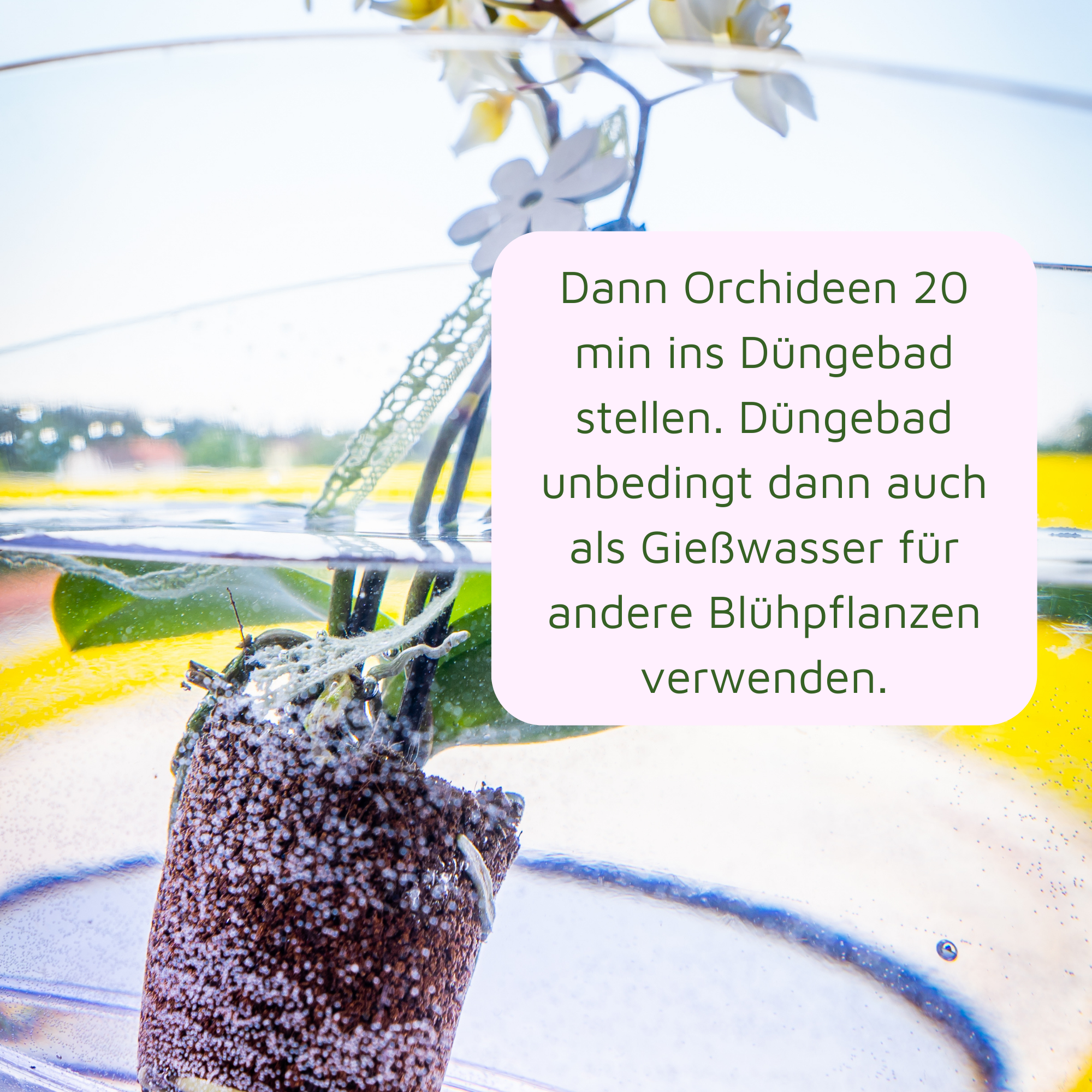 Fülle ein großes Gefäß mit drei Liter Wasser und löse einen Dünge-Tab darin auf. Die Nährstoffe verteilen sich gleichmäßig im Wasser und begünstigen die langsame, schonende Aufnahme für die Orchidee.